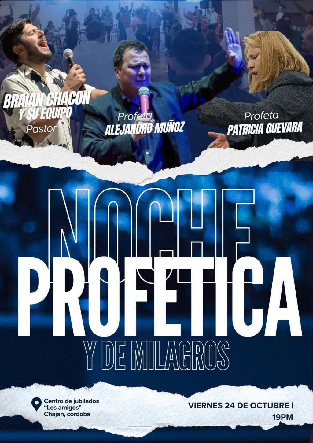 La "Noche Profética" busca congregar a creyentes y personas en busca de consuelo espiritual, en un ambiente de recogimiento y manifestación de fe. El evento es de entrada libre y gratuita, abierto a todo público, y se desarrollará en las instalaciones del centro de jubilados, ubicado en la localidad de Chajan Cordoba.
