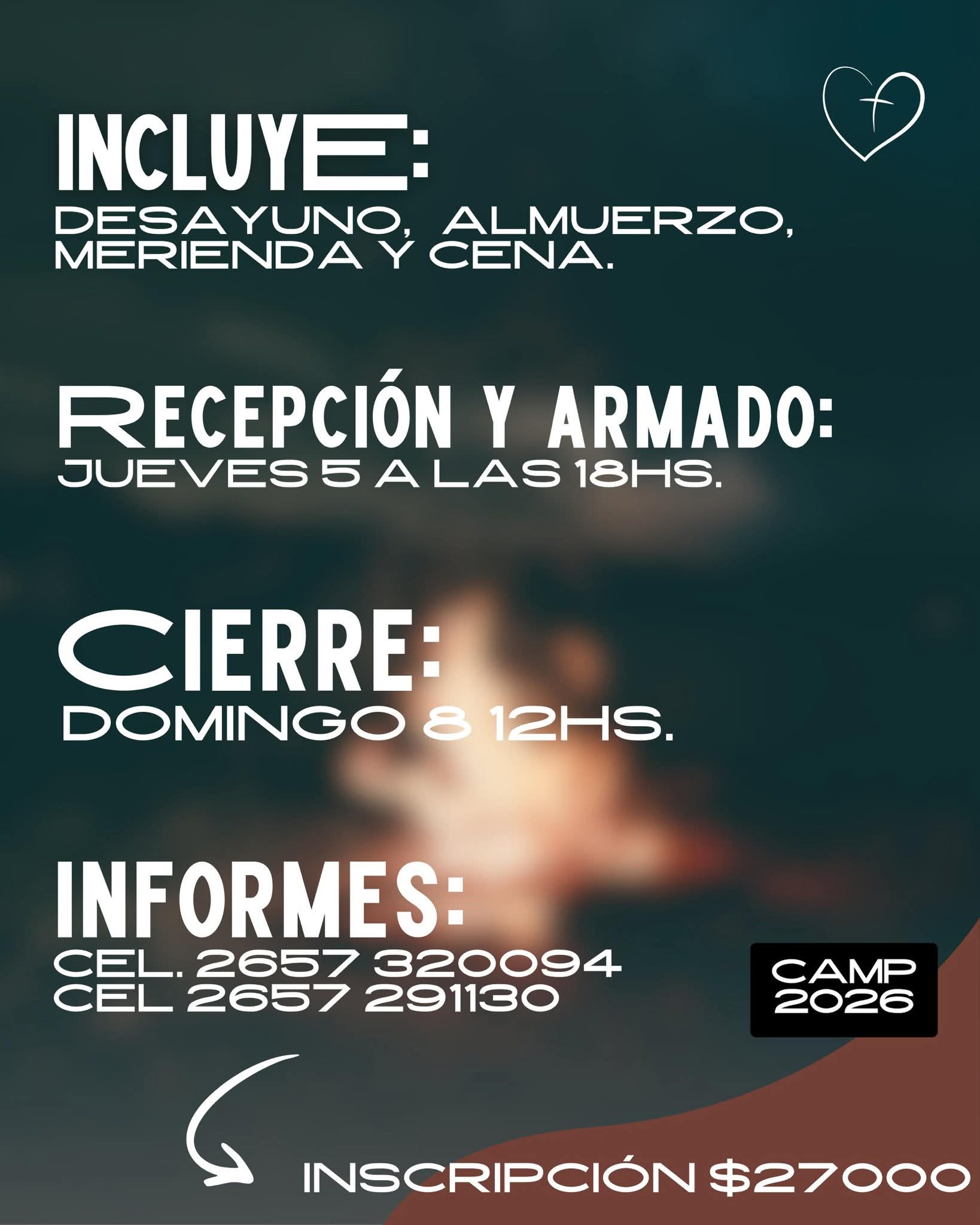 contará con un programa completo que incluye alojamiento, todas las comidas (desayuno, almuerzo, merienda y cena), actividades recreativas, talleres y momentos de enseñanza espiritual.