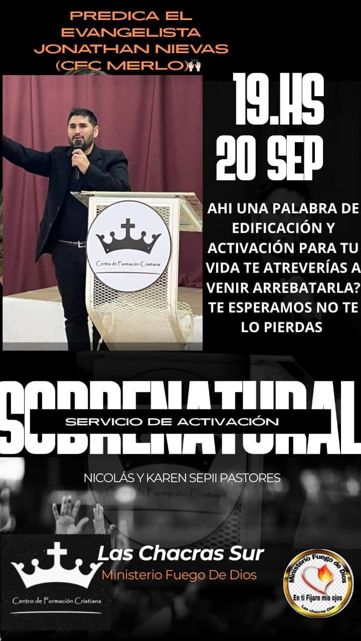 El Ministerio Fuego de Dios se prepara para recibir al evangelista Jonathan Nievas, proveniente del Centro de Formación Cristiana de Merlo (San Luis), quien estará compartiendo un poderoso mensaje de edificación y transformación espiritual.