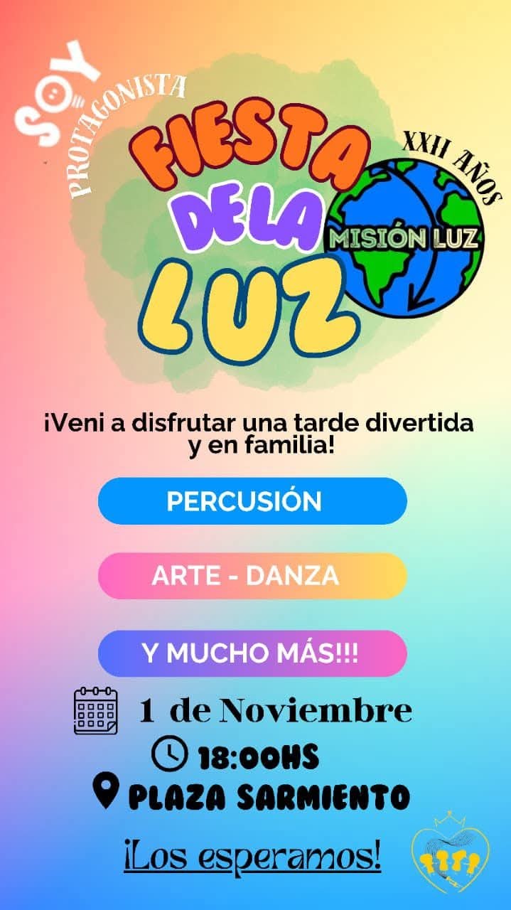 Bajo el lema “Soy Protagonista”, la Misión Luz invita a la comunidad a participar de una tarde familiar llena de diversión, arte y entretenimiento, que se llevará a cabo el viernes 1 de noviembre a las 18:00 horas en la Plaza Sarmiento.