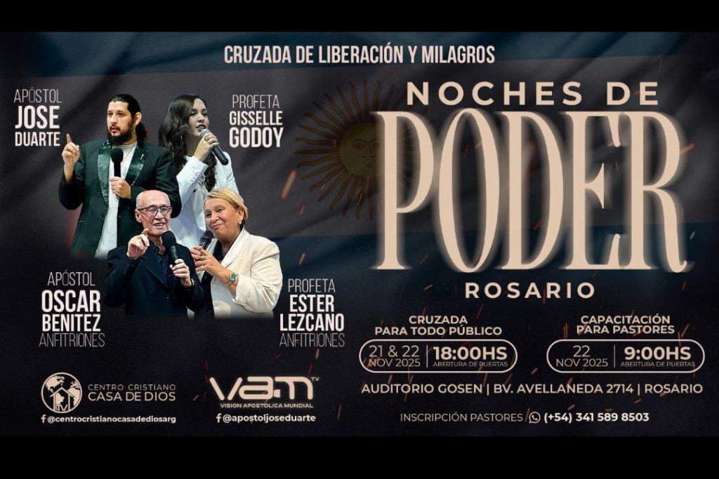 La ciudad de Rosario será sede de una masiva "Cruzada de Liberación y Milagros" los días 21 y 22 de noviembre de 2025. El evento, que promete "Noches de Poder" para todo público, tendrá lugar en el Auditorio Gosen, ubicado en Boulevard Avellaneda 2714.