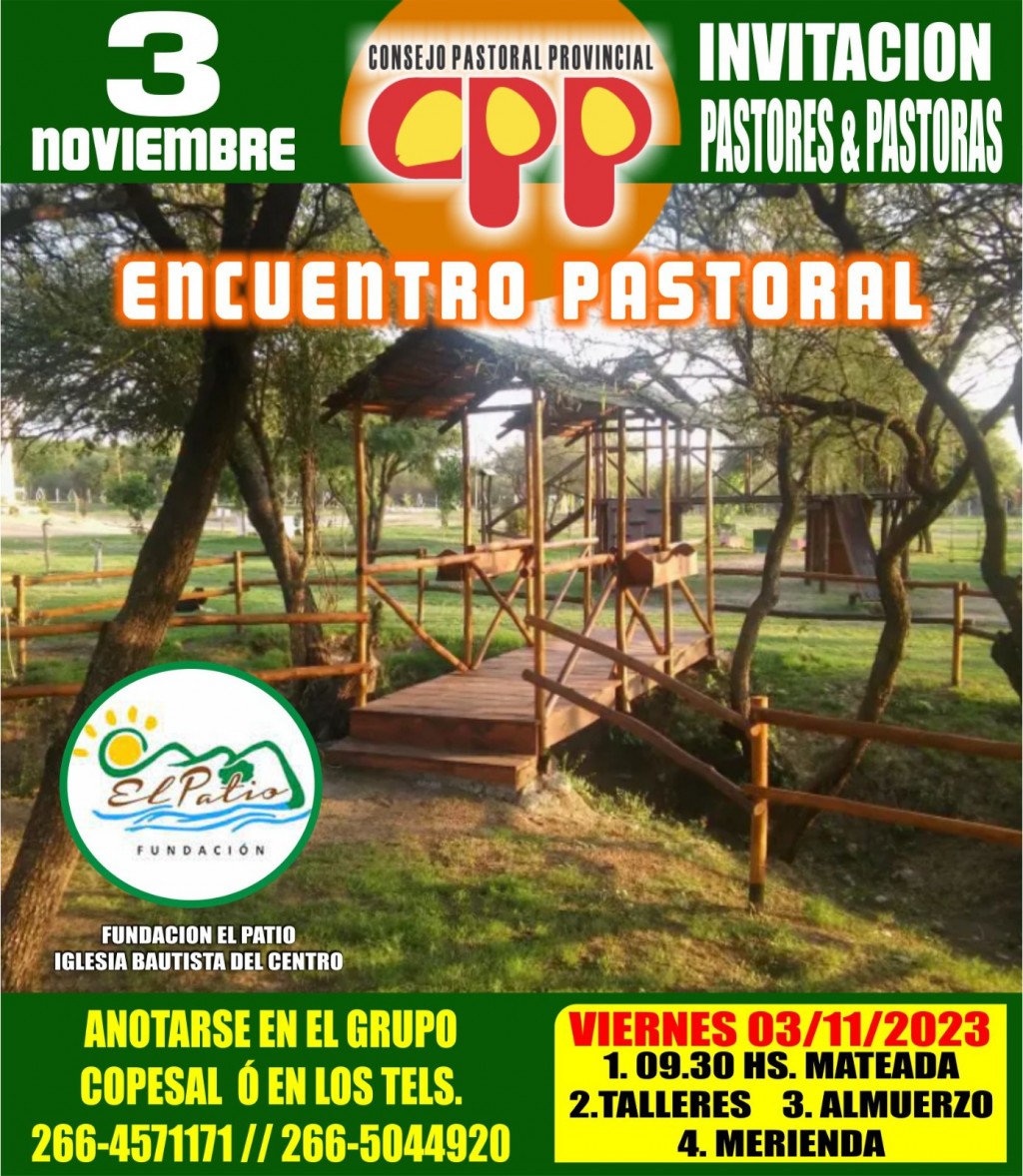 El día 3 de noviembre a las 9:30 am se va a desempeñar un ENCUENTRO PASTORAL organizado por el CONSEJO PASTORAL PROVINCIAL, el mismo se va a dar efecto en el predio de la FUNDACIÓN EL PATIO-IGLESIA BAUTISTA DEL CENTRO