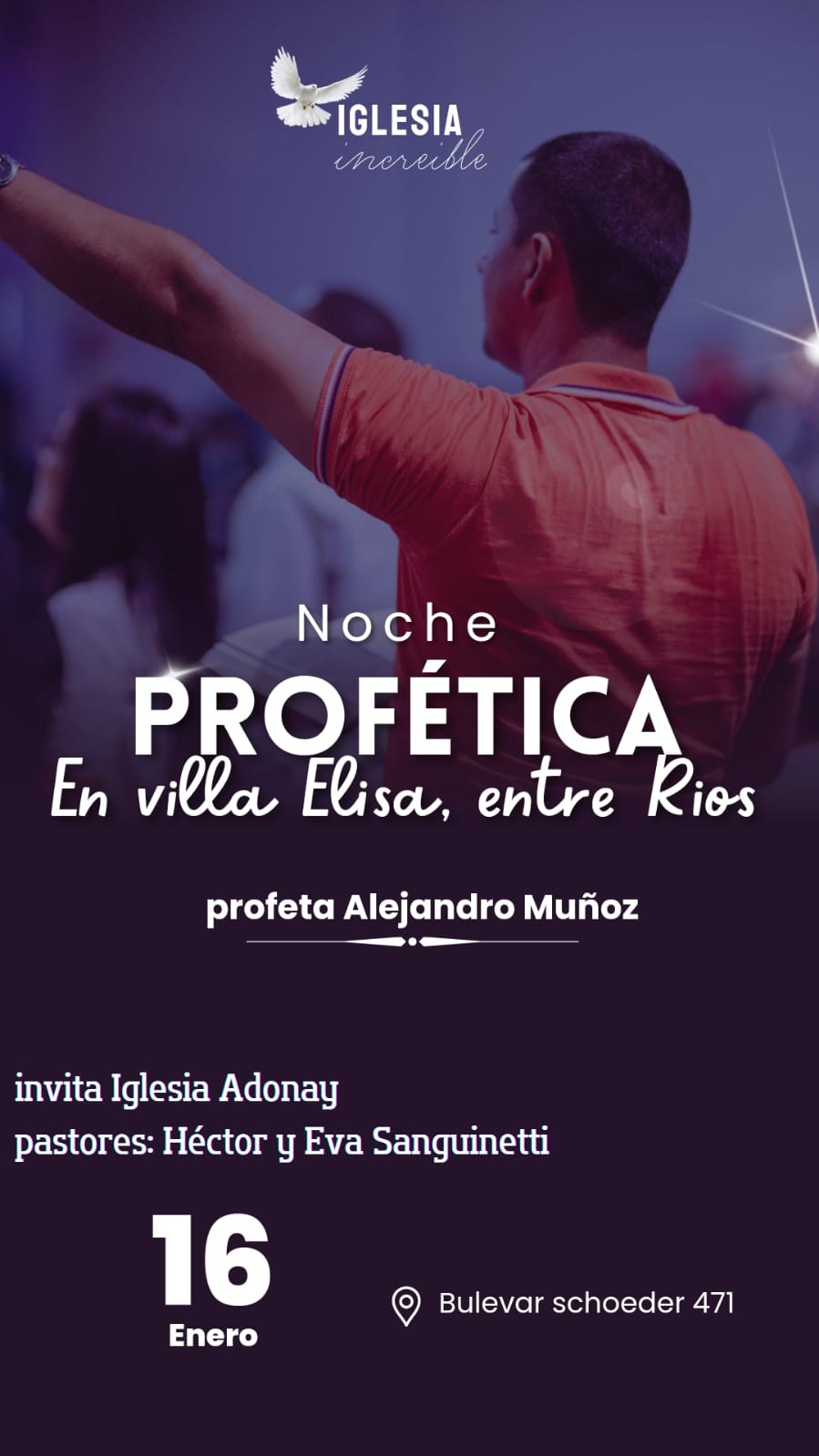 La Iglesia Adonay invita a todos los residentes de Villa Elisa y sus alrededores a unirse a esta experiencia única de conexión espiritual. Durante la Noche Profética, el profeta Alejandro Muñoz compartirá mensajes profundos y reveladores que tienen el poder de tocar los corazones de aquellos que asistan. El Bulevar Schoender 471 será el epicentro de esta noche mágica. La iglesia ha preparado minuciosamente el espacio para crear un ambiente acogedor y lleno de energía positiva, donde los fieles podrán experimentar una comunión especial con lo divino. Esta noche promete ser un encuentro de reflexión, adoración y revelación. La Iglesia Adonay confía en que cientos de personas se congreguen para escuchar las palabras inspiradoras del profeta Alejandro Muñoz, quien es conocido por su sabiduría y claridad al interpretar los mensajes celestiales. La entrada a esta experiencia espiritual única en su tipo es totalmente gratuita. La Iglesia Adonay desea asegurarse de que todos tengan la oportunidad de asistir y recibir las bendiciones que este evento ofrece.